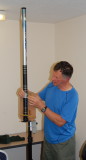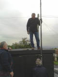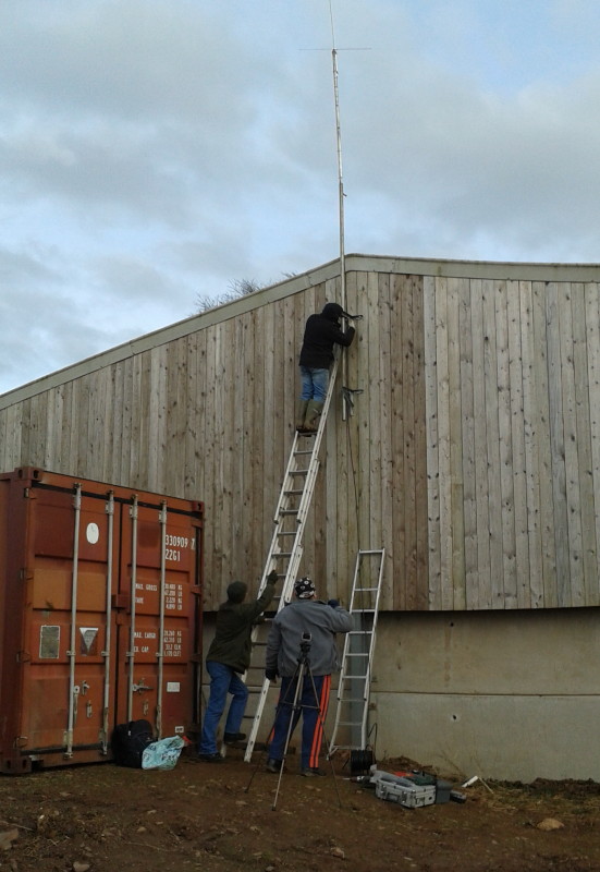 | Keith won the ladder lottery and was soon climbing up to hold on in the freezing gale. He successfully clamped the mast to the barn exterior. Meanwhile Pete led the cable crew inside fitting power and RF cables.