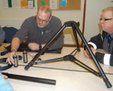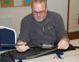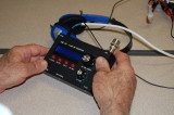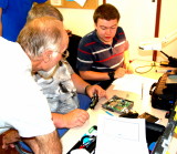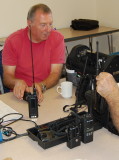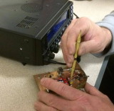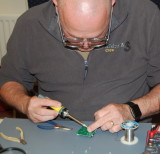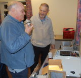 | Pete G3ZVI then gave a fascinating glimpse of his years of professional communication engineering by showing members how to correctly terminate crimped and soldered BNC and N-type connectors onto co-ax cable. Keith G7NBU gazed wistfully at Pete's work as he crimped a BNC onto a cable end in 50 seconds flat. Pete apologized for being so slow(!), saying that his wife was actually better at this than he is!!