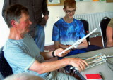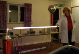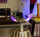 Soon Alec was showing his collection of Tesla coils and their plasma discharges. From small battery powered coils he built up to his 250,000 volt coil and its arcs. A rotating vane driven by discharges and even music played though the discharges from coils. Many more pictures at our Gallery.