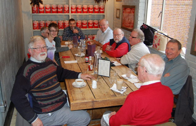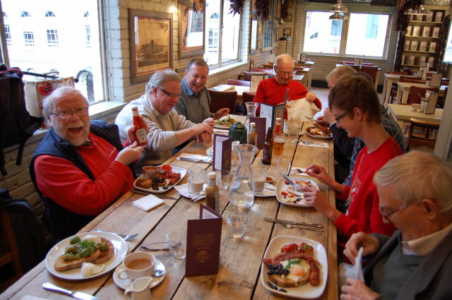 17 December 2016 The Annual EARS Christmas Breakfast was held at Bill's on Gandy Street today. Members with big appetites arrived at 09:00 to tackle "Full English" breakfasts. On the window side of the table and at the head are are Jon G8XTK, Ivor G6ATJ, Keith G7NBU and Tony M0GJX. |