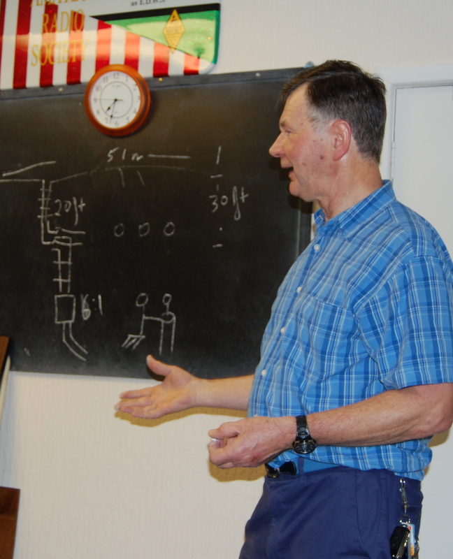 Linden M0TCF related his recent experiences operating a Field Day trying out new antennas using fibre-glass masts. Paul G4RRA explained the challenges of rigging a sixty feet high mast and typical problems that are encountered, such as forgetting the fourth guy line. |