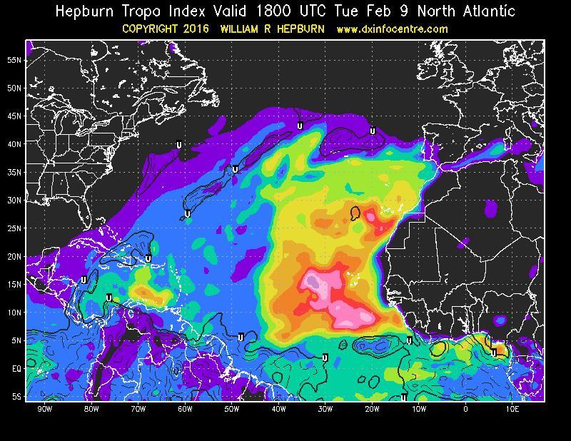 Paul played recordings of an Azores beacon CU8DUB heard in the UK. European radio amateurs vie to be the first to log a VHF contact with the American continent as the first to do it will win the Brendan Trophy. When conditions are good, amateurs in the Canary Islands can be heard from sites in Cornwall and southern Ireland using tropospheric ducting. |
