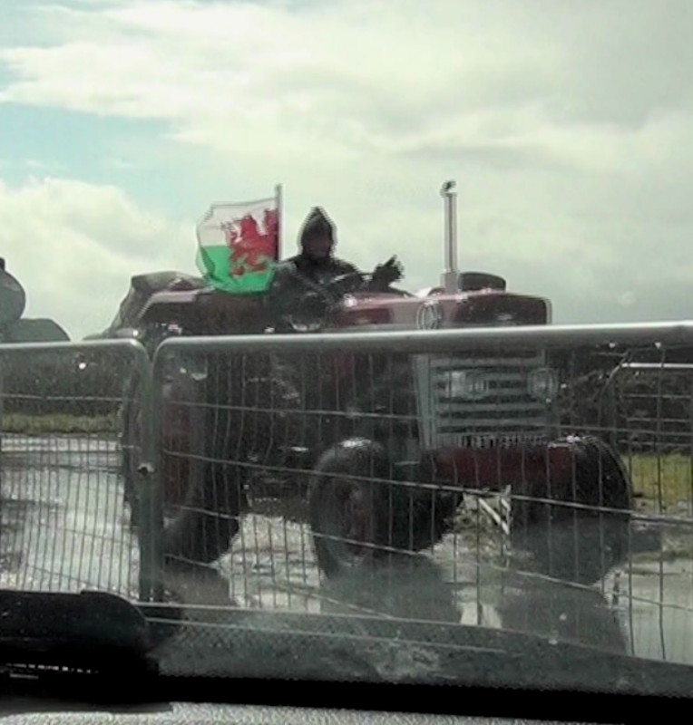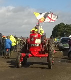 | Vintage tractors from around the UK were transported to Smeatharpe Arena for the event. Over 600 pre-1995 vehicles arrived and were driven along both tarred and non-maintained roads. Luckily there was always a tractor at hand if a breakdown occurred. These views show tractors crossing the finish line in very wet conditions.