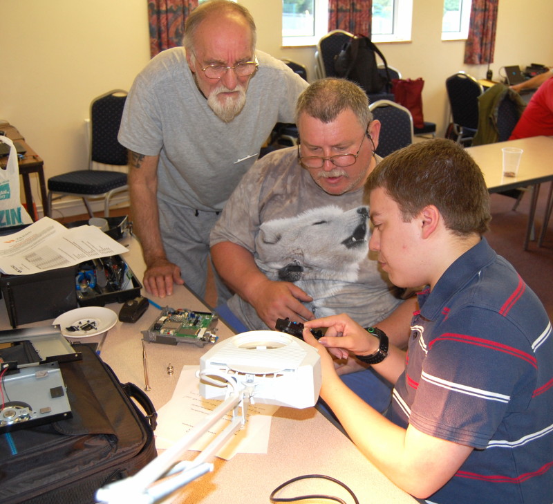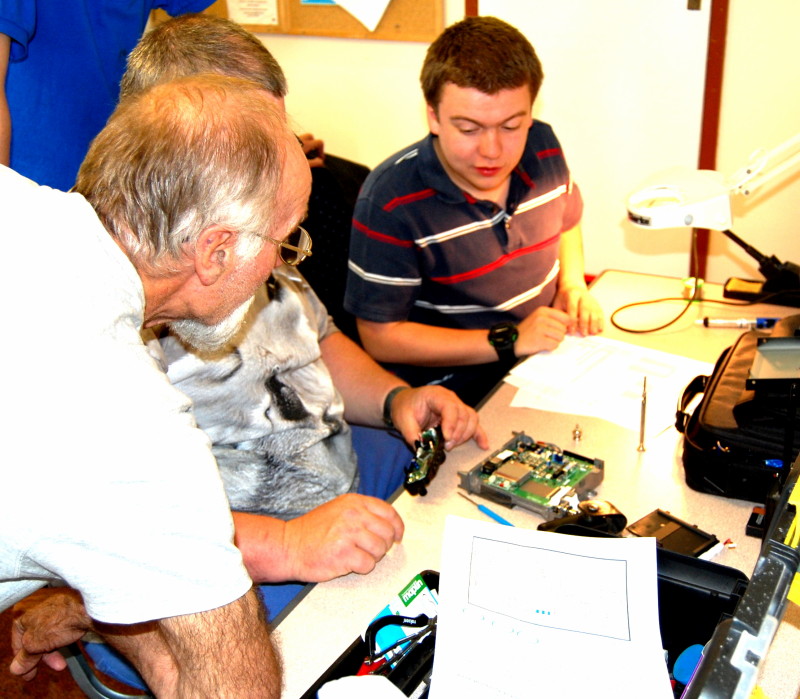 22 June 2016 A hands-on evening for the club with the whiff of molten solder mingling with the tapping of keyboards and the whistles of Fldigi. Linden M0TCF led a team modifying his Yaesu FT-817 to transmit on the 60m band. After that he added a CTCSS board to an FDK 7000 with which students can practice. |