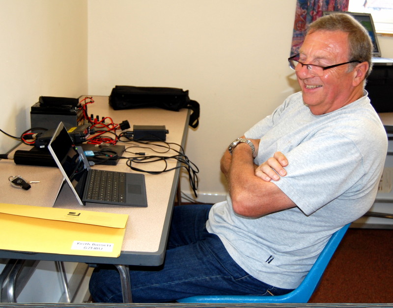 Keith G7NBU brought in a Windows 10 laptop to configure for data operations. John G8XQQ and Nick M0NRJ assisted him in configuring Fldigi with his digital interface and audio adaptor. Using their own VHF rigs they then verified BPSK-250 transmission using Fldigi across the room. |
