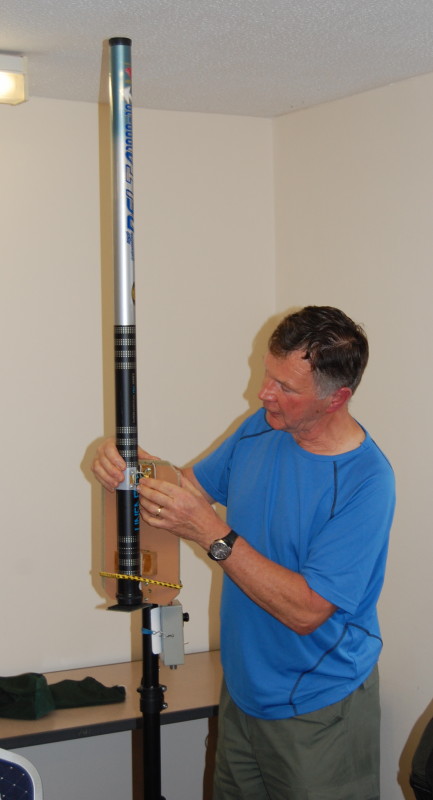 Stuart G3YXO demonstrated his home-brewed fibreglass mast support. Using a loudspeaker tripod, he manufactured an adaptor bracket and tuning unit. This is for use with his 3 band QRP transceiver.