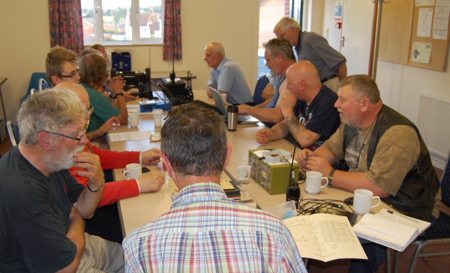 On the opposite side are John G4AP, Allan G1JXI, Slade M6SQB, Pete G3ZVI and Bas G0FGE. Nick M0NRJ is lurking with a camera.